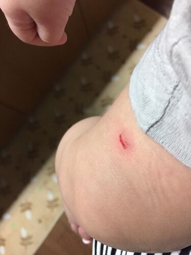 ハイハイどころかつかまり立ち…一歩ぐらいなら手を離しても歩いてしまう八ヶ月のウチの子ですが、とうとうやらかしました はじめての怪我 一瞬目を離した隙に洗濯物にダイブしたようで、洗濯物の中にあったチャックか何かで引っ掻いたようで、腿にキズが〜〜…
